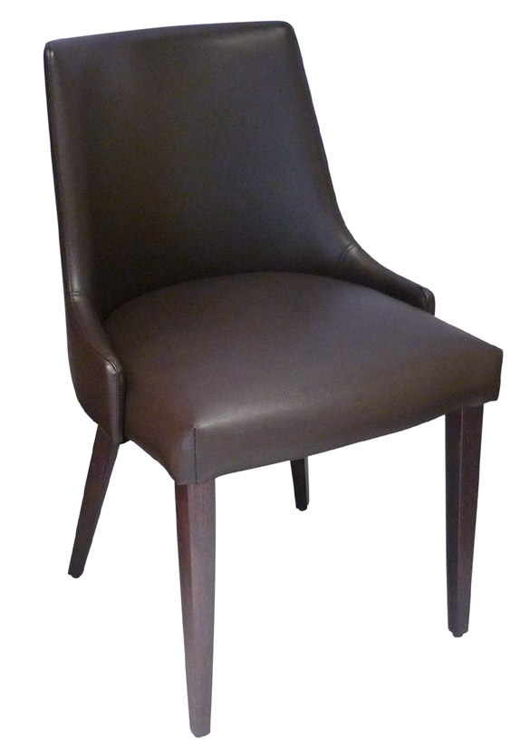Stylish and very comfortable side chair upholstered in Kim Brown faux leather and polished Dark Walnut legs